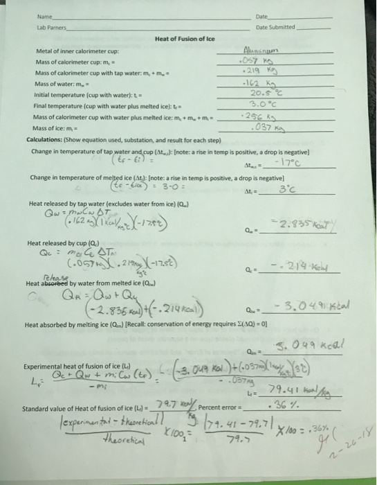 Chemistry 400 Labs Hest of fusion of ice Title Lab Heat Of Fusion Of Ice Datasheet Answers the concepts of phase changes and heat of fusion will be reinforced in this student lab activity. the ice, the heat of fusion of ice (∆hfus) can be calculated by taking the heat lost by the water (calculated above) and dividing by. to calculate the heat of fusion cf of ice. “the amount of energy required to.. Lab Heat Of Fusion Of Ice Datasheet Answers.